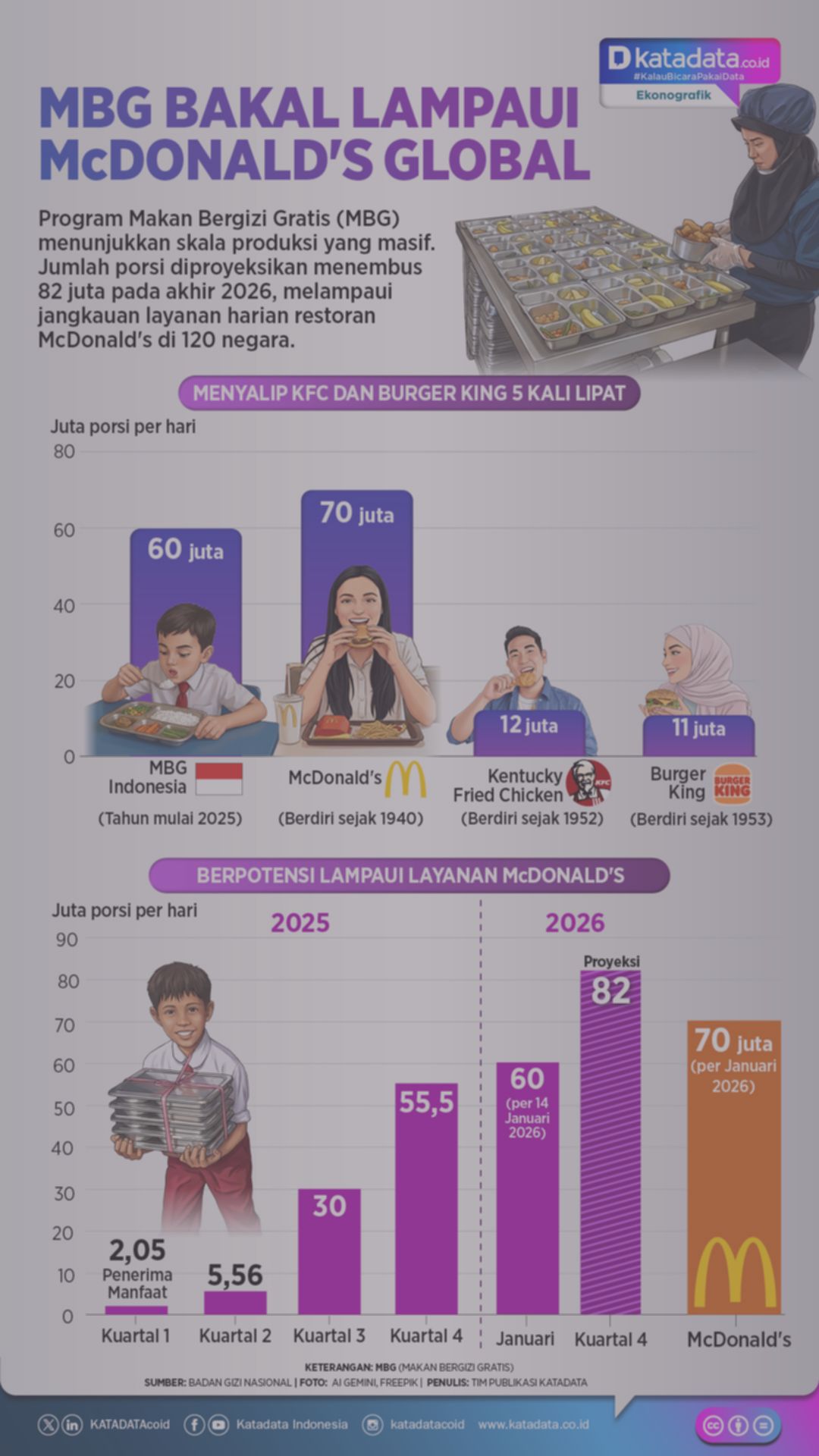Program MBG (Makan Bergizi Gratis) diproyeksikan melayani 82 juta orang, menyaingi bahkan berpotensi melampaui skala pelayanan harian global restoran cepat saji McDonald’s.